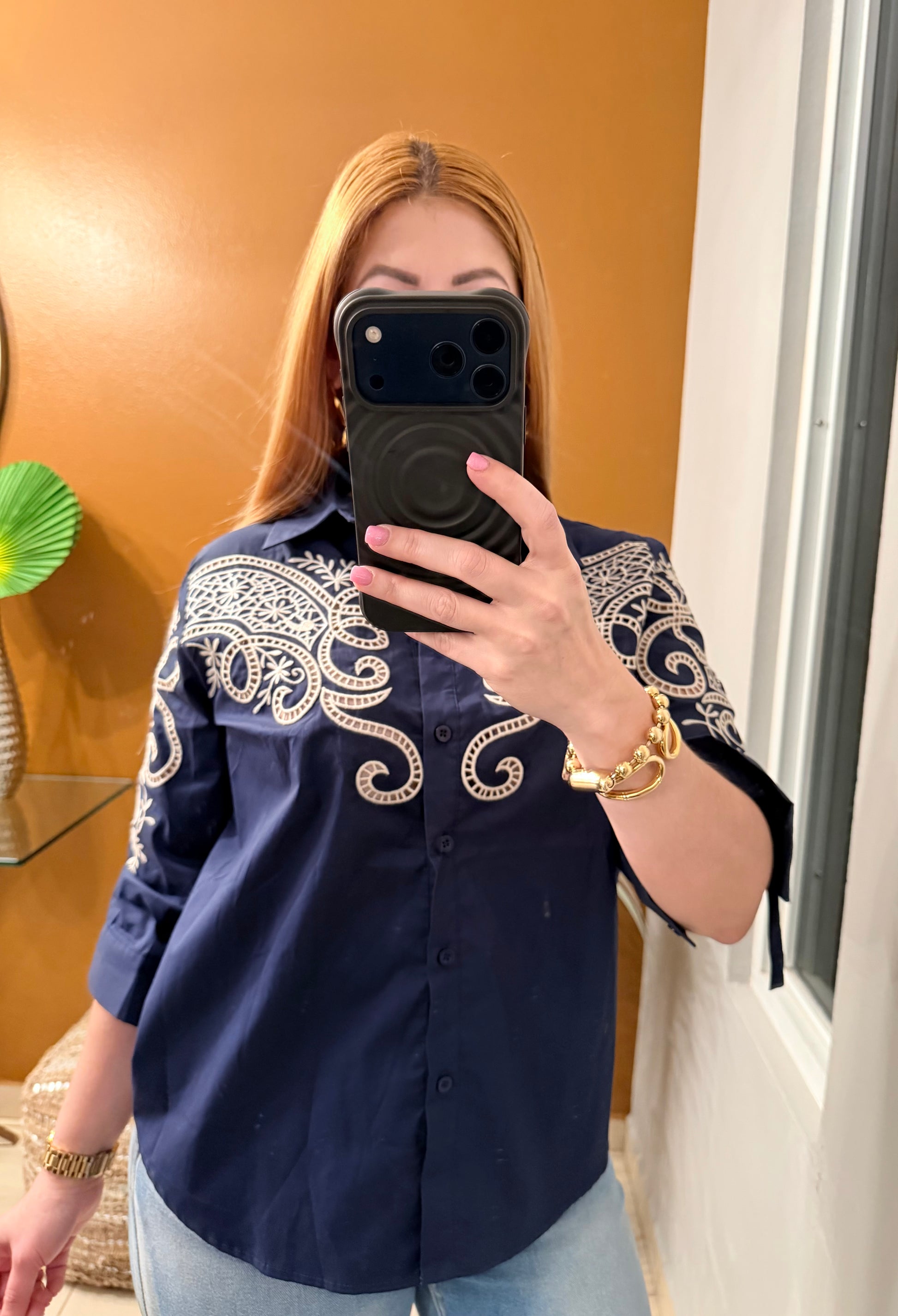Hermosa blusa de botones con detalles bordados