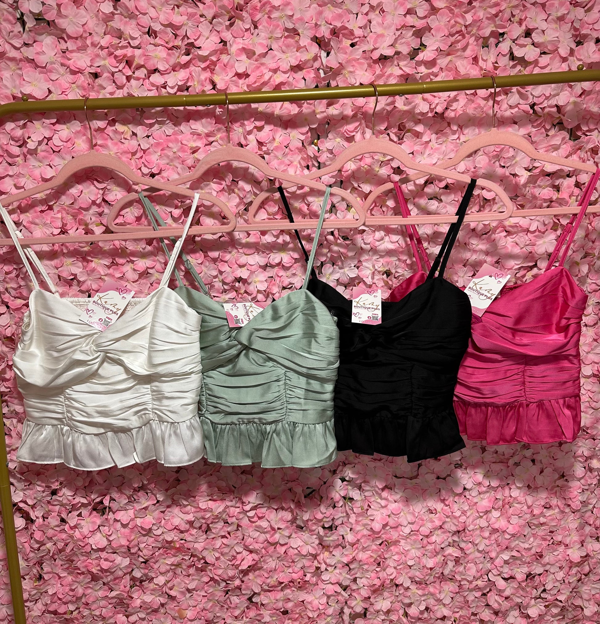 Top corto satinado con detalle fruncido y volantes en el dobladillo. Disponible en blanco, verde menta, negro y fucsia. Un básico elegante que combina fácilmente con faldas o jeans para un look sofisticado.