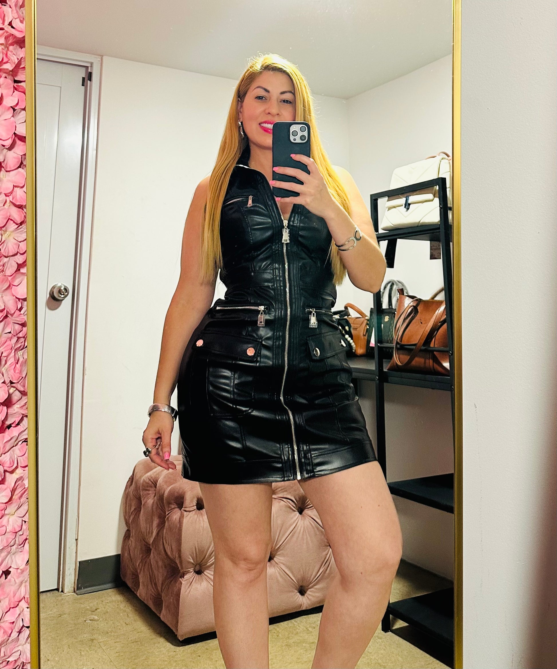 Atrevido y sofisticado. Este vestido de efecto cuero con cierres metálicos es ideal para destacar con actitud. Su corte moderno estiliza la silueta y aporta un aire de poder y confianza. Ideal para eventos nocturnos o salidas con estilo.